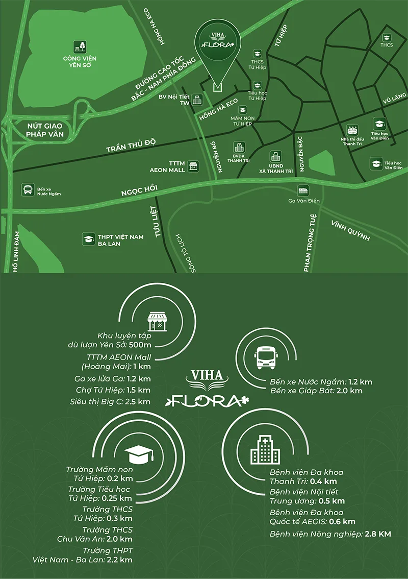 Tọa lạc tại KĐT Hồng Hà Eco City (Thanh Trì, Hà Nội), Viha Flora sở hữu vị trí thuận lợi khi nằm gần các trục giao thông huyết mạch như Quốc lộ 1A, Vành đai 3 và cao tốc Bắc - Nam. Nhờ đó, cư dân có thể dễ dàng di chuyển vào khu vực trung tâm thành phố cũng như kết nối nhanh chóng tới các quận lân cận và các tỉnh phía Nam Hà Nội như Bắc Ninh, Hải Phòng, Lạng Sơn cũng như sân bay Nội Bài thông qua hệ thống đường vành đai và cao tốc hiện đại.