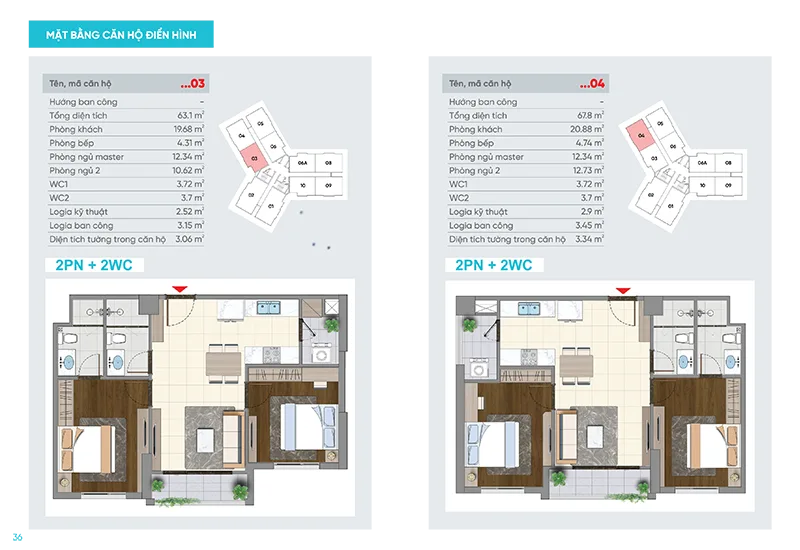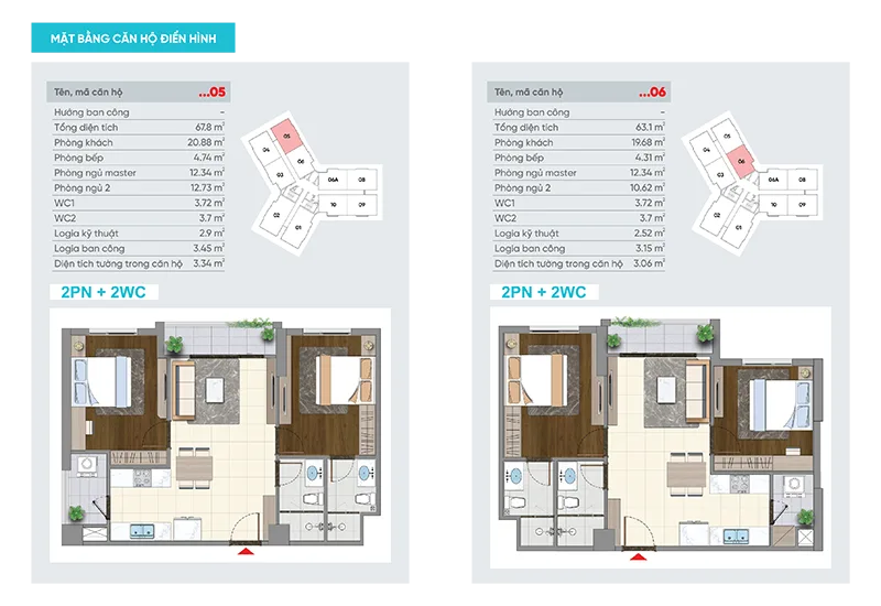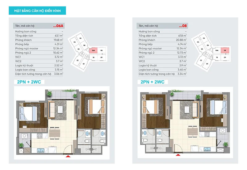 - Căn hộ 2PN (2WC) – Diện tích 63m²: 4 căn/sàn (căn số 03, 06, 07, 10)