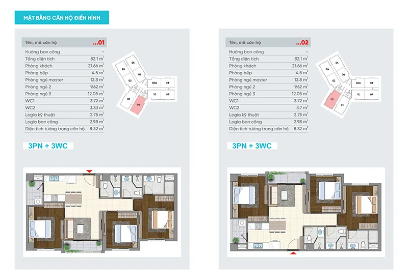 - Căn hộ 3PN – Diện tích 82m²: 2 căn/sàn (căn số 01, 02)