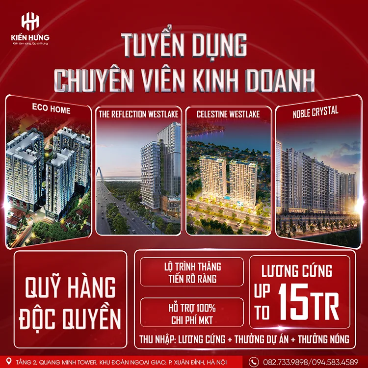Gia nhập ngay ĐỊA ỐC KIẾN HƯNG để được hưởng cơ chế hấp dẫn, cạnh tranh trên thị trường, thu nhập HẤP DẪN theo năng lực. KIẾN HƯNG luôn chào đón bạn, đồng hành để phát triển và khai phá tài năng của bạn, trở thành chuyên gia thực thụ trong lĩnh vực BĐS.